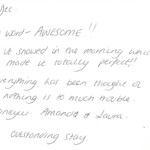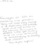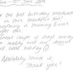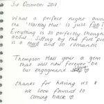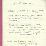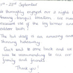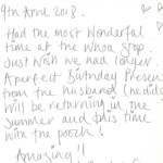 Here at Thompson Hall Retreat we pride ourselves in giving the best service and the most unforgettable get away you can have. Our love and care have gone into creating our retreat especially for you to get away and take a breathe of fresh air, Away from the hustle and stress of the rat race. Please find below some of our amazing guests reviews left in our guestbooks. We thank each and every person for choosing our Retreat for your stay and hope to see you all again. We loved reading these warm words and hope that we can keep up the outstanding effort to make you all feel appreciated and special.