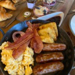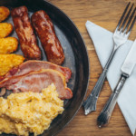 British Beef Burger with Folgate bacon, Jiffler blue cheese, burger sauce, cowboy candy, served with hand cut triple cooked chips & BBQ beans.