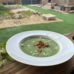Pea & nettle soup finished with pea shoots and garlic croutons.
