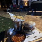 British Beef Burger with bacon, Jiffler blue cheese, burger sauce, cowboy candy, served with hand cut chips from Bootiful Buckets, & smoked BBQ beans.