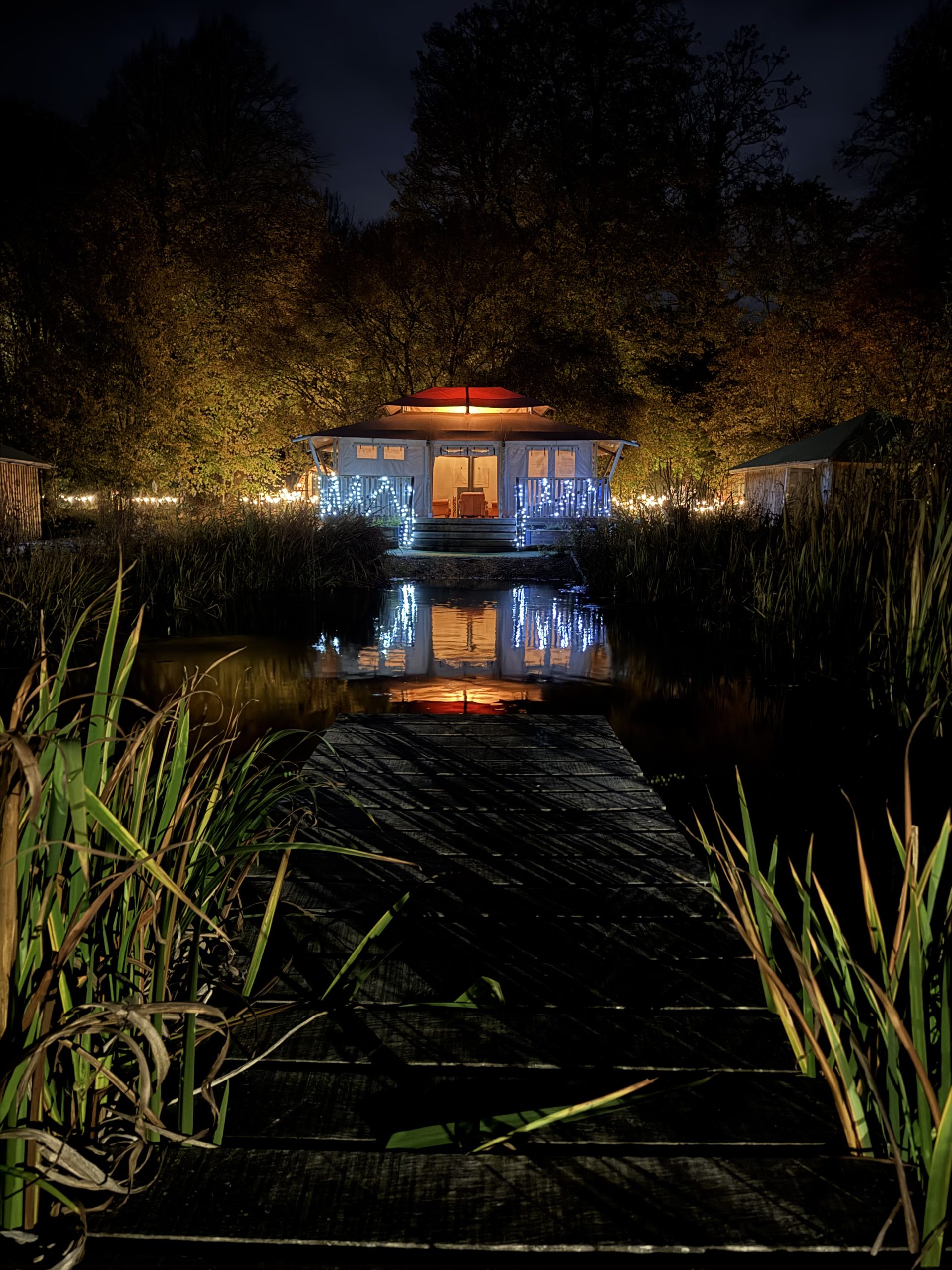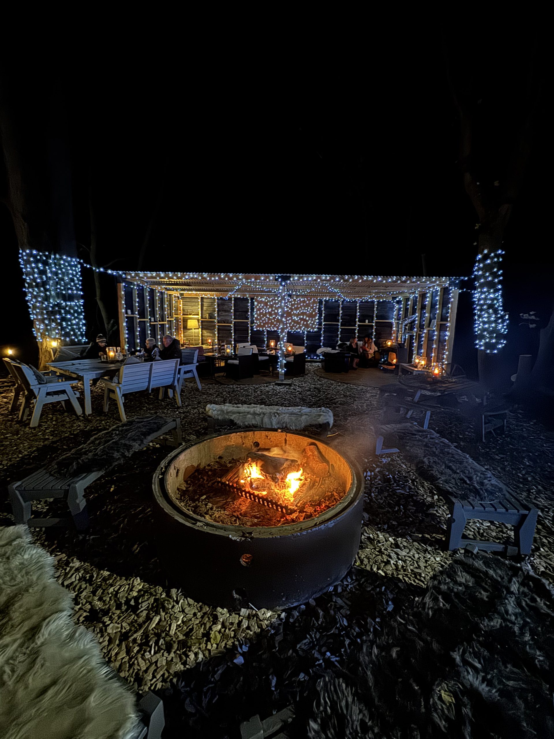 This is an outdoor experience featuring an open fire surrounded by benches for socializing. The tables are located in our covered veranda, which includes a woodburner to shield you from rain and wind; however, one side remains open. We recommend bringing a blanket, dressing warmly, and wearing appropriate footwear, as the setting is in the woods with woodchip paths.
