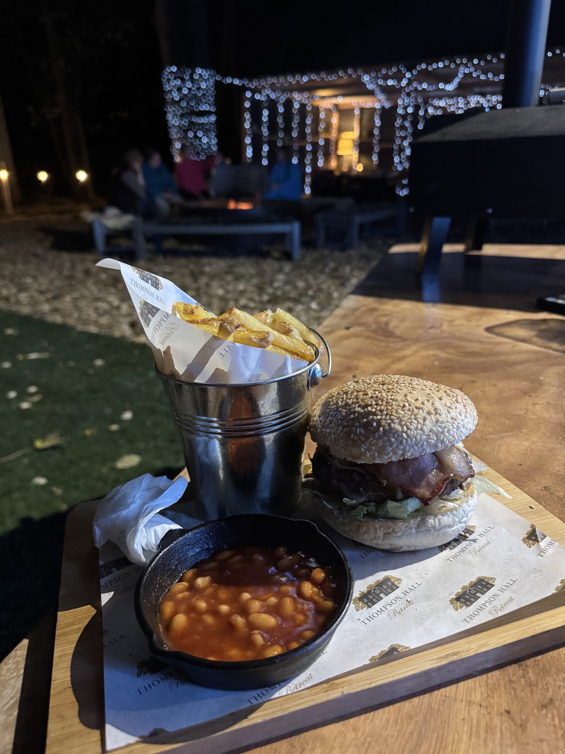 British Beef Burger with bacon, Jiffler blue cheese, burger sauce, cowboy candy, served with hand cut chips from Bootiful Buckets, & smoked BBQ beans.