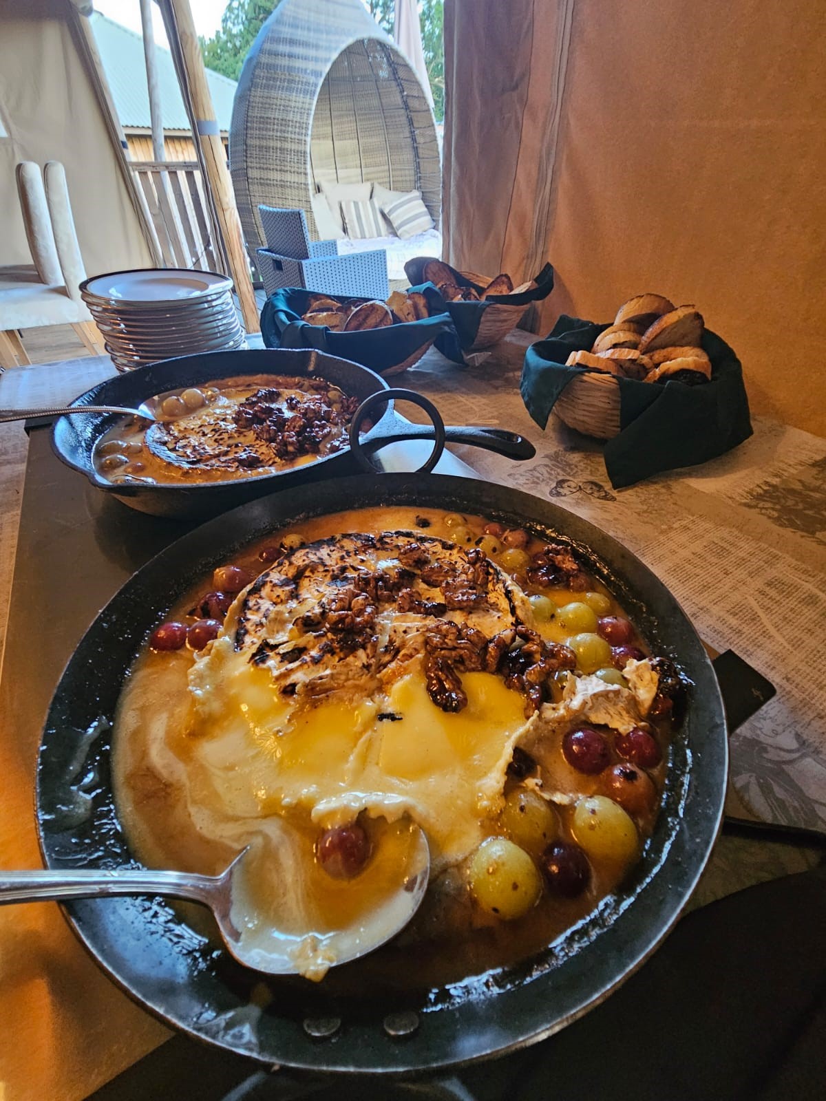 Skillet fired, Breckland Brie cooked over the coals with toasted balsamic walnuts, grapes, Cranberry & fresh herbs.