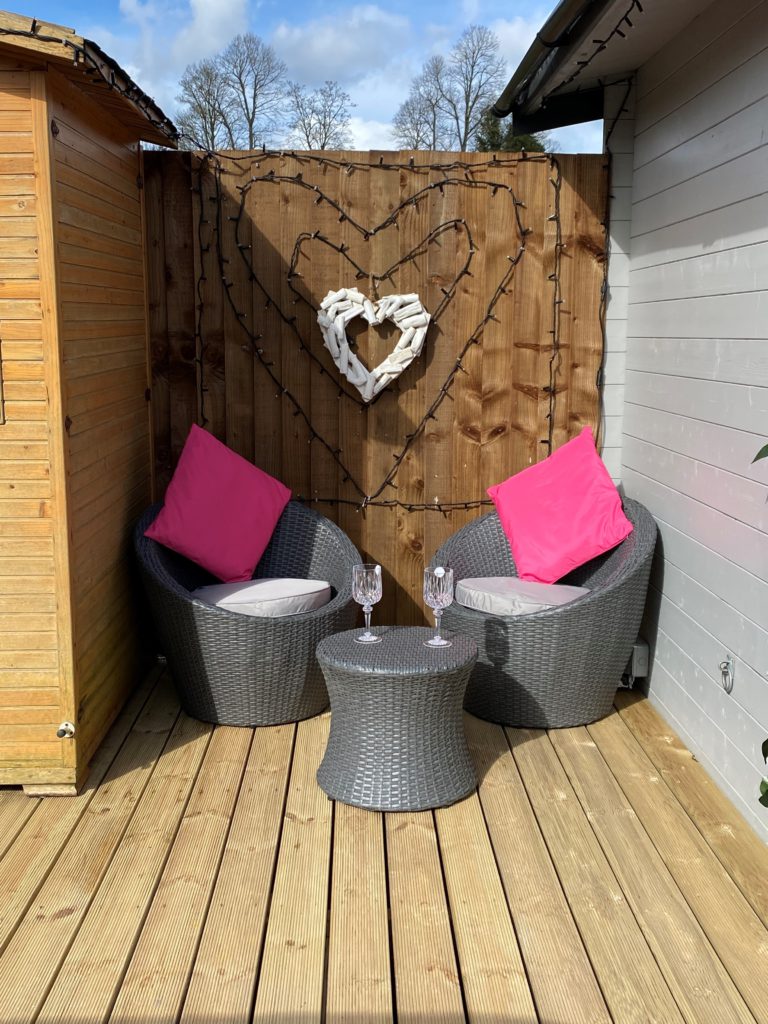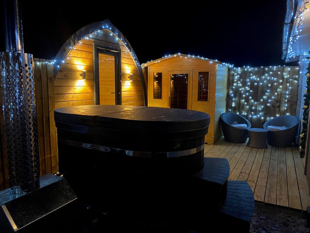 Out of the back of your cabin through your door you will step into a fully enclosed private with 6ft fence Spa area, this is equipped with a wood fired hot tub , infrared sauna and seating area. As the evening comes the fairy lights will light up this magical area and you can sit and gaze and the stars while enjoying our hot tub.